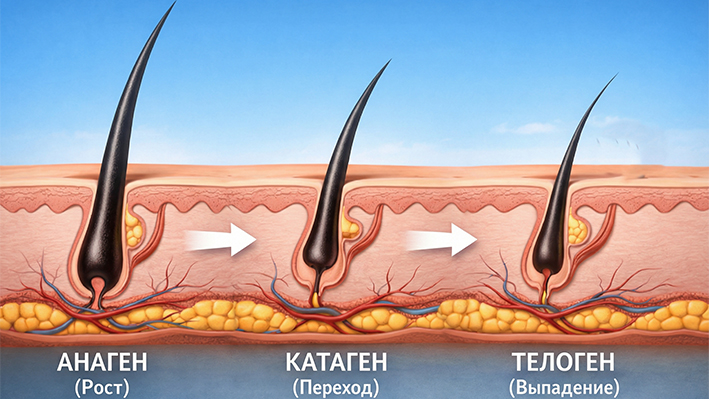 Следующий этап — катаген. Это переходная стадия, которая длится всего несколько недель. Активное формирование стержня останавливается, фолликул постепенно уменьшается в размере и готовится ко «сну». На этой стадии влиять на скорость уже не получится.
