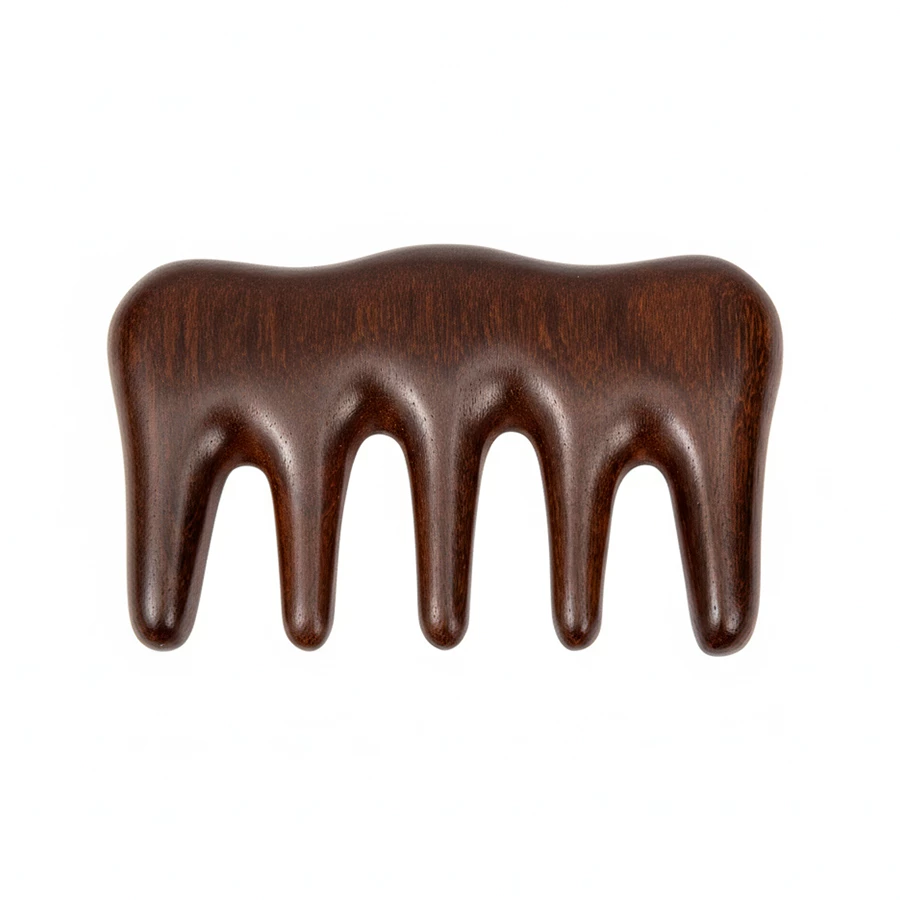 Гребень выполнен из высококачественного древесного материала с роскошным тёплым оттенком. Изготовлен из натурального сандала, известного своей долговечностью, приятной текстурой и благородным оттенком. Эргономичная форма с пятью широкими закруглёнными зубцами подходит для бережного распутывания любых типов волос.