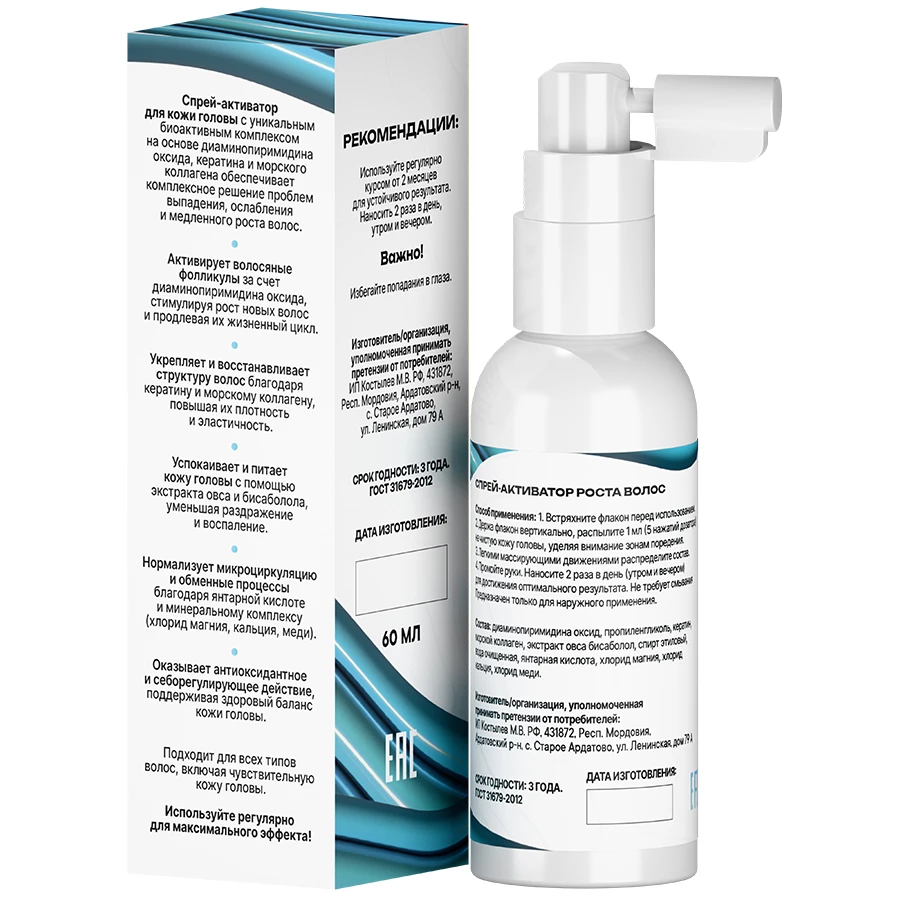 Спрей-активатор для кожи головы с уникальным биоактивным комплексом на основе диаминопиримидина оксида, кератина и морского коллагена обеспечивает комплексное решение проблем выпадения, ослабления и медленного роста волос.