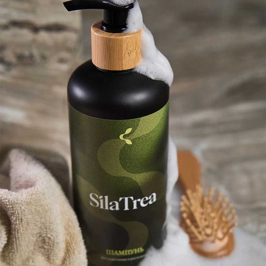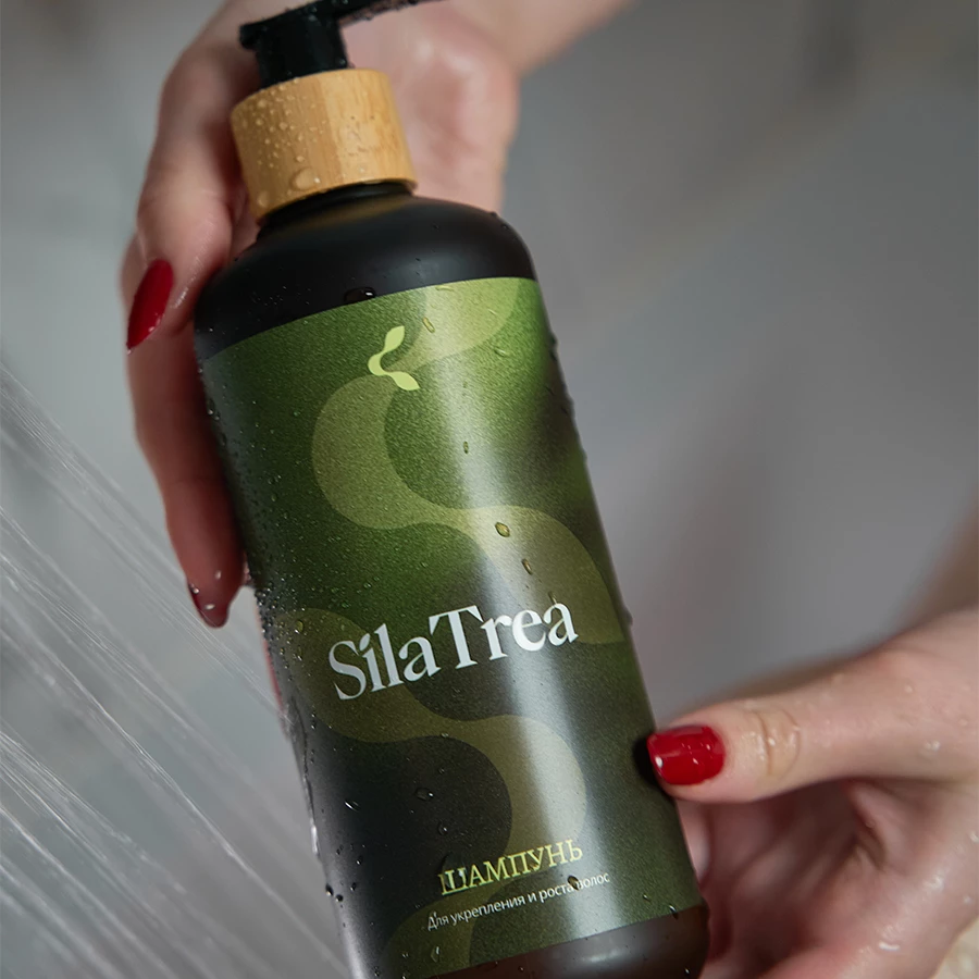 Укрепляющий шампунь против выпадения волос SilaTrea питает кожу головы, стимулирует рост волос и повышает их плотность.