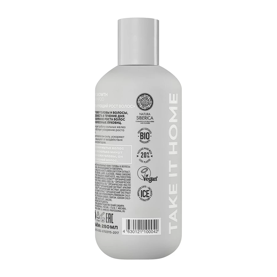 Шампунь стимулирует рост волос, мягко очищая и укрепляя их благодаря органическим экстрактам сибирского женьшеня и пробиотикам.