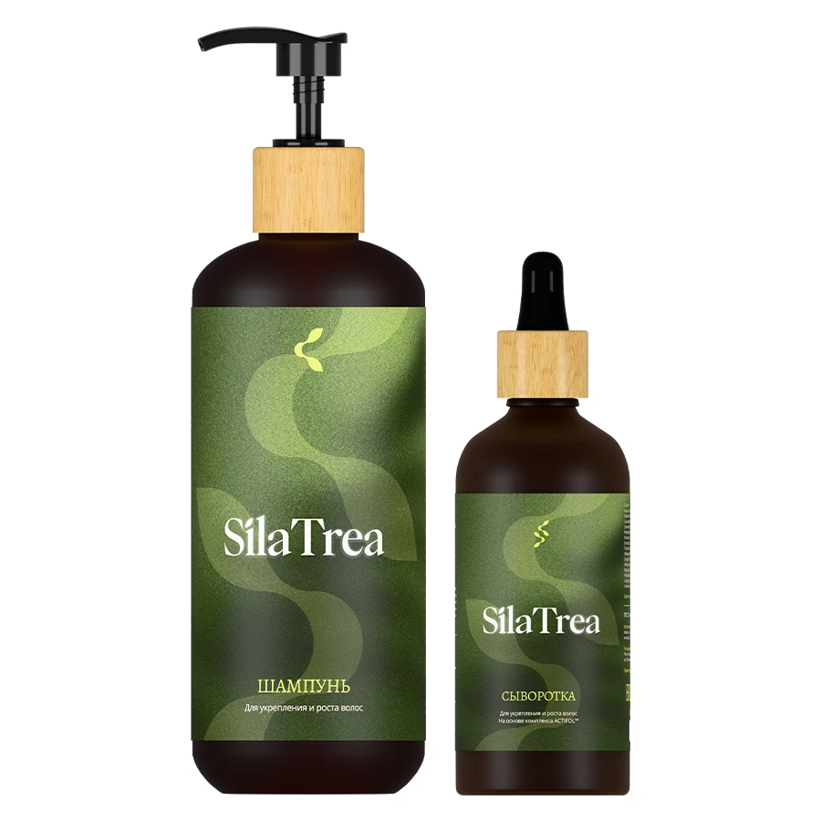 Откройте секрет крепких и густых волос с набором для роста волос SilaTrea! В комплект входит шампунь и сыворотка для укрепления и роста.